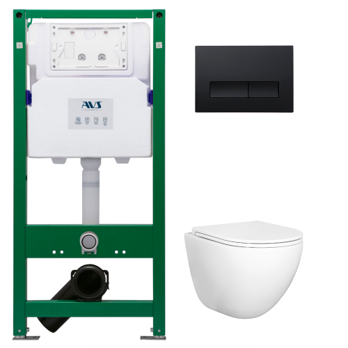 Комплект AVS 3в1: Инсталляция для унитаза 809-0006-7732C + Унитаз подвесной 801-0045-P-T2-GW + Клавиша смыва 809-0011-MB черная, прямоугольные кнопки