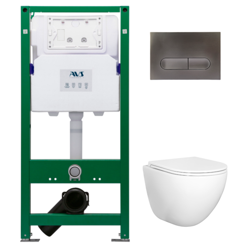 Комплект AVS 3в1: Инсталляция для унитаза 809-0006-7732C + Унитаз подвесной 801-0045-P-T2-GW + Клавиша смыва 809-0015-GM оружейная сталь, овальные кнопки