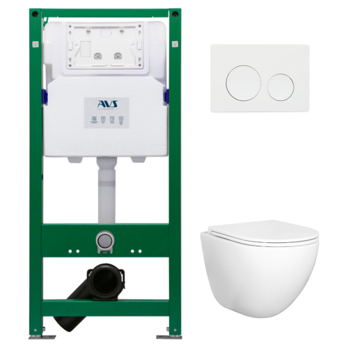 Комплект AVS 3в1: Инсталляция для унитаза 809-0006-7732C + Унитаз подвесной 801-0045-P-T2-GW + Клавиша смыва 809-0012-GW белая, круглые кнопки