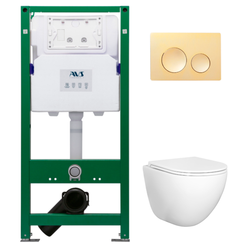 Комплект AVS 3в1: Инсталляция для унитаза 809-0006-7732C + Унитаз подвесной 801-0045-P-T2-GW + Клавиша смыва 809-0012-MG матовое золото, круглые кнопки