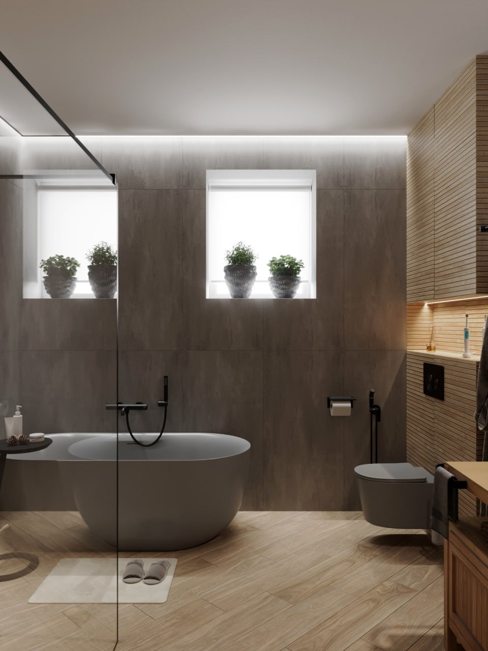 В этом проекте цветная сантехника от Аквамир прекрасно сочетается с текстурами бетона и дерева. Акриловая ванна AVS Сильва, подвесной унитаз Спектр и раковина AVS - все в благородном сером матовом цвете.