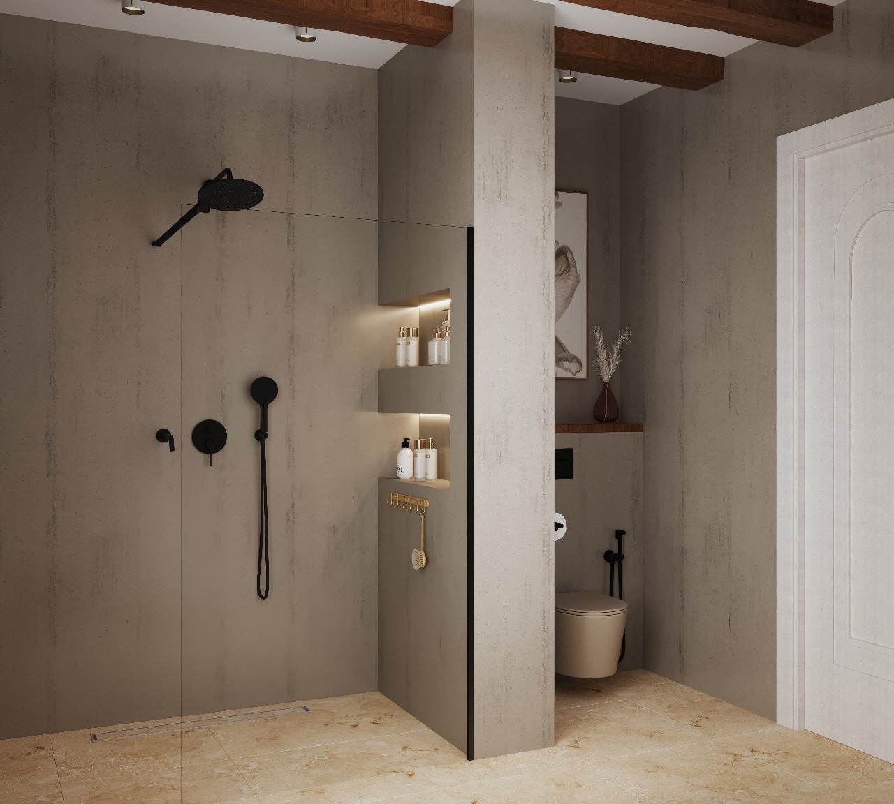 В сердце этого пространства – отдельно стоящая ванна глубокого оливкового цвета. Она словно драгоценный камень, притягивающий взгляд и приглашающий окунуться в объятия расслабления. Здесь же, рядом, расположена душевая зона, призванная пробуждать и дарить заряд бодрости.