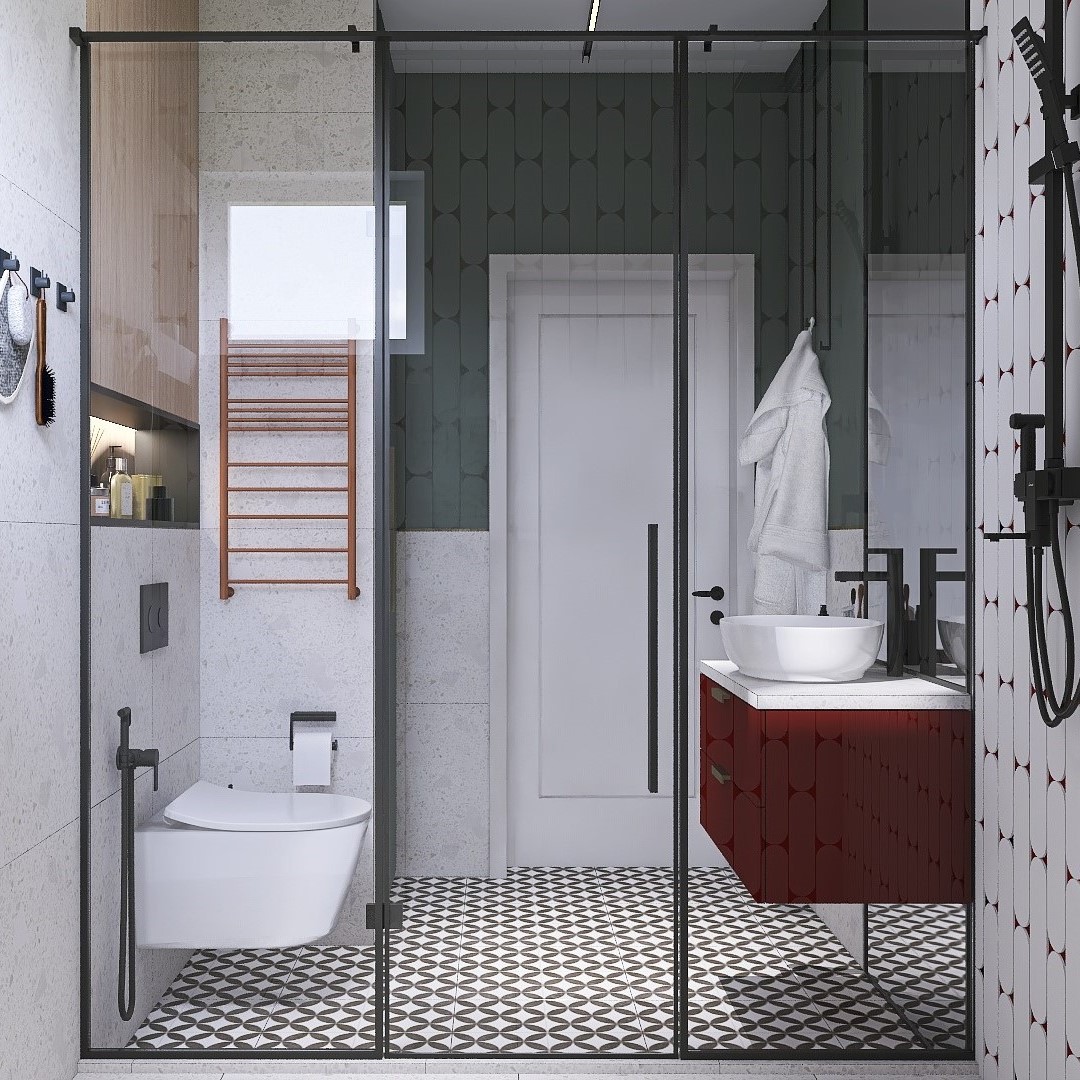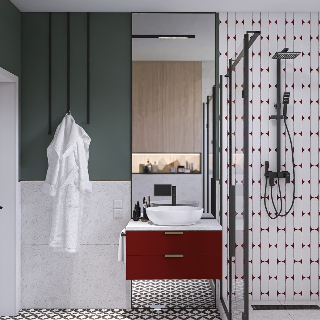 Зеленая стена - оазис посреди городского хаоса. Цвет свежей листвы, пробивающейся сквозь бетонные джунгли, дарит ощущение гармонии и близости к природе. Она наполняет санузел жизнью и энергией, уравновешивая сдержанность тераццо и эксцентричность кабанчика. "Эхо Города" - это гармоничное сочетание городского стиля и природной свежести, современности и ностальгии.