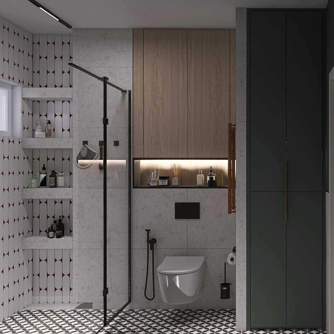 Светло-серая плитка тераццо, доминирующая в пространстве, словно туманный горизонт мегаполиса, задает тон спокойствия и элегантности. Ее приглушенная палитра - холст, на котором расцветают яркие акценты.