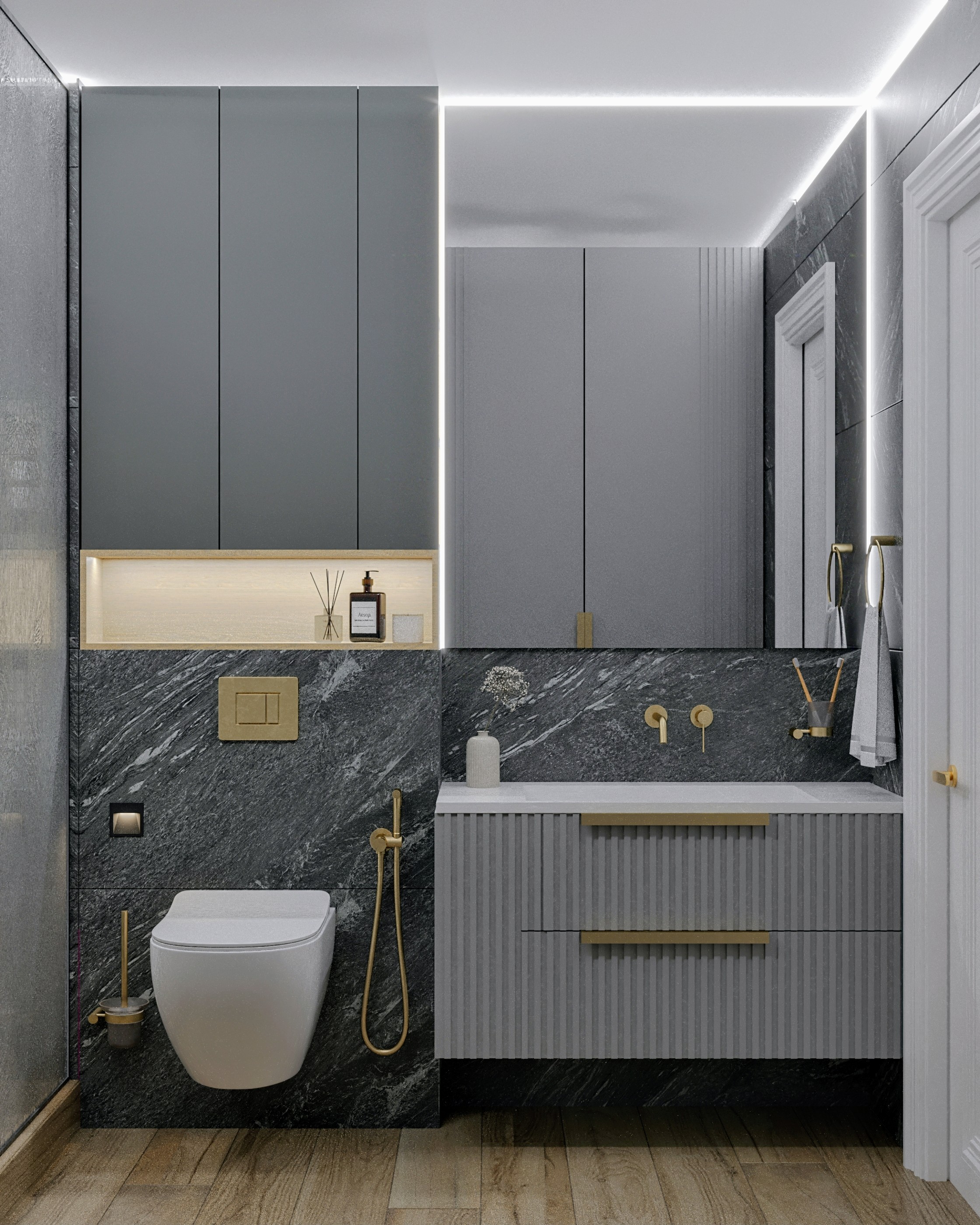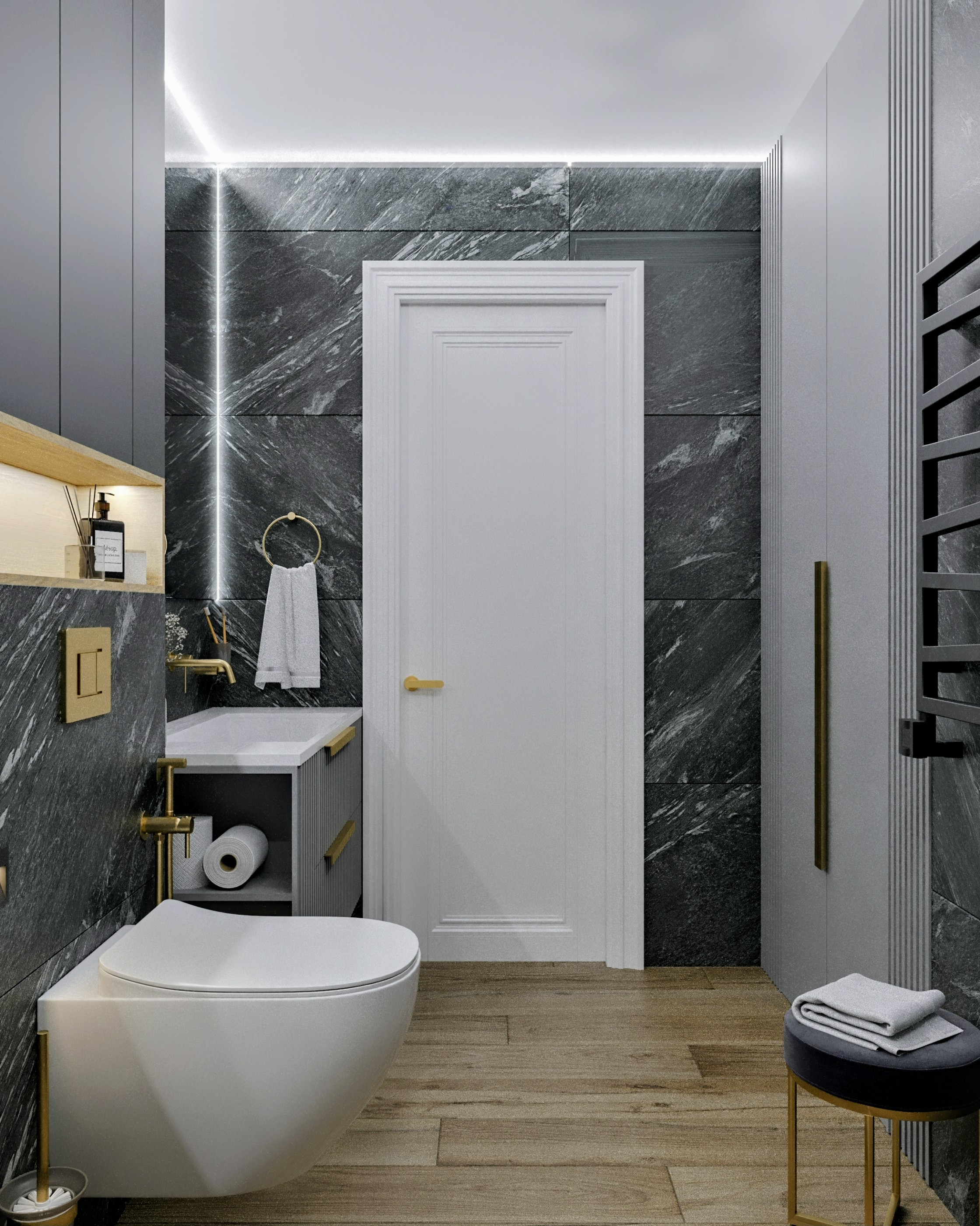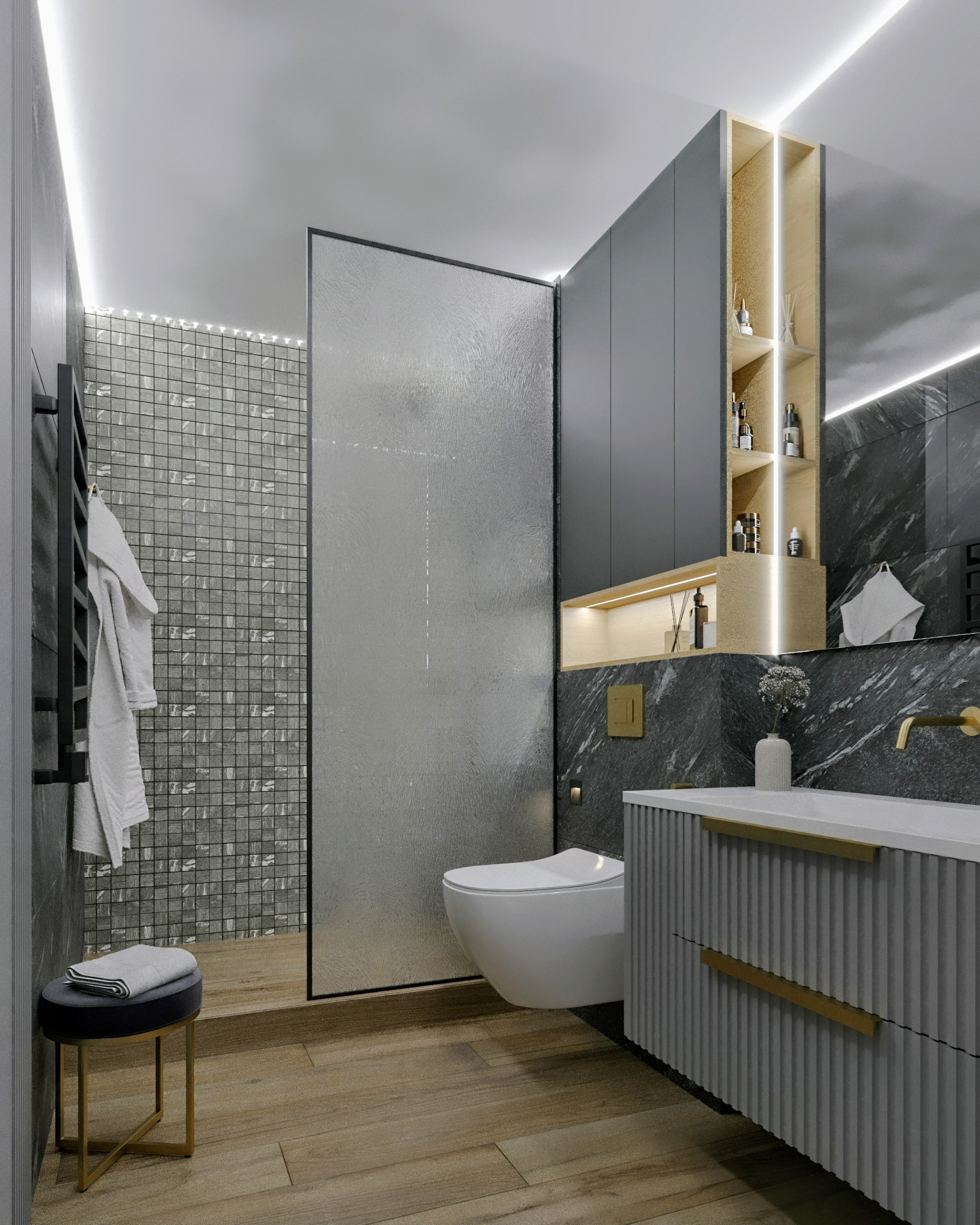 Эскизы просторного санузла с душевой для квартиры в ЖК «Левобережье». Стильно, изысканно, практично.