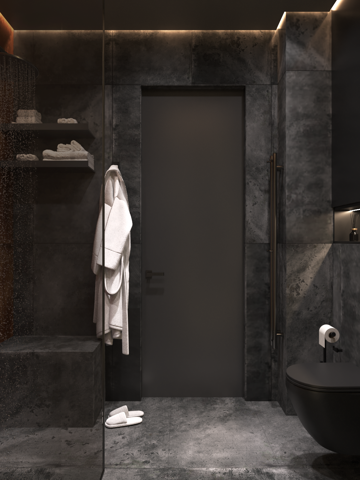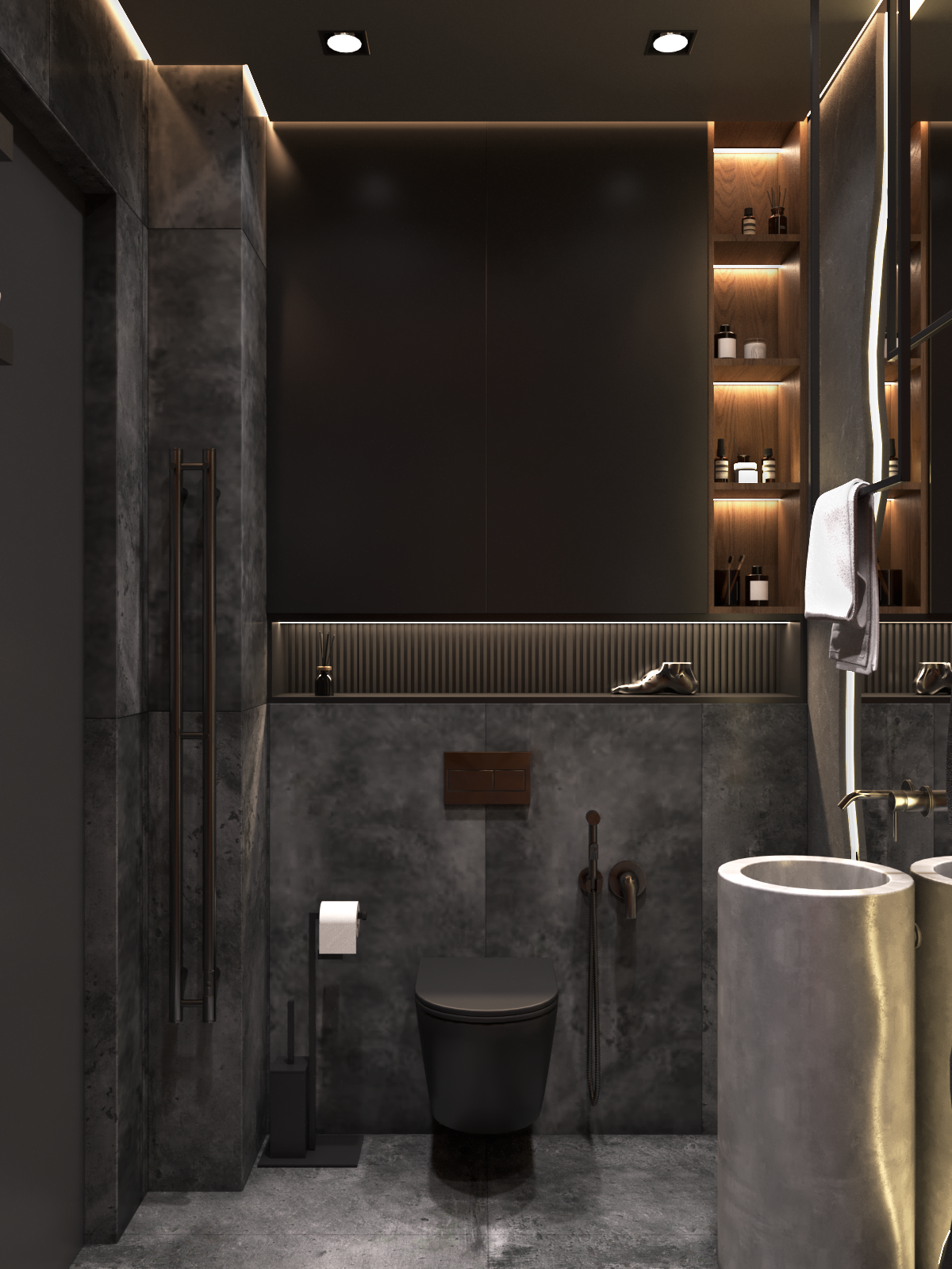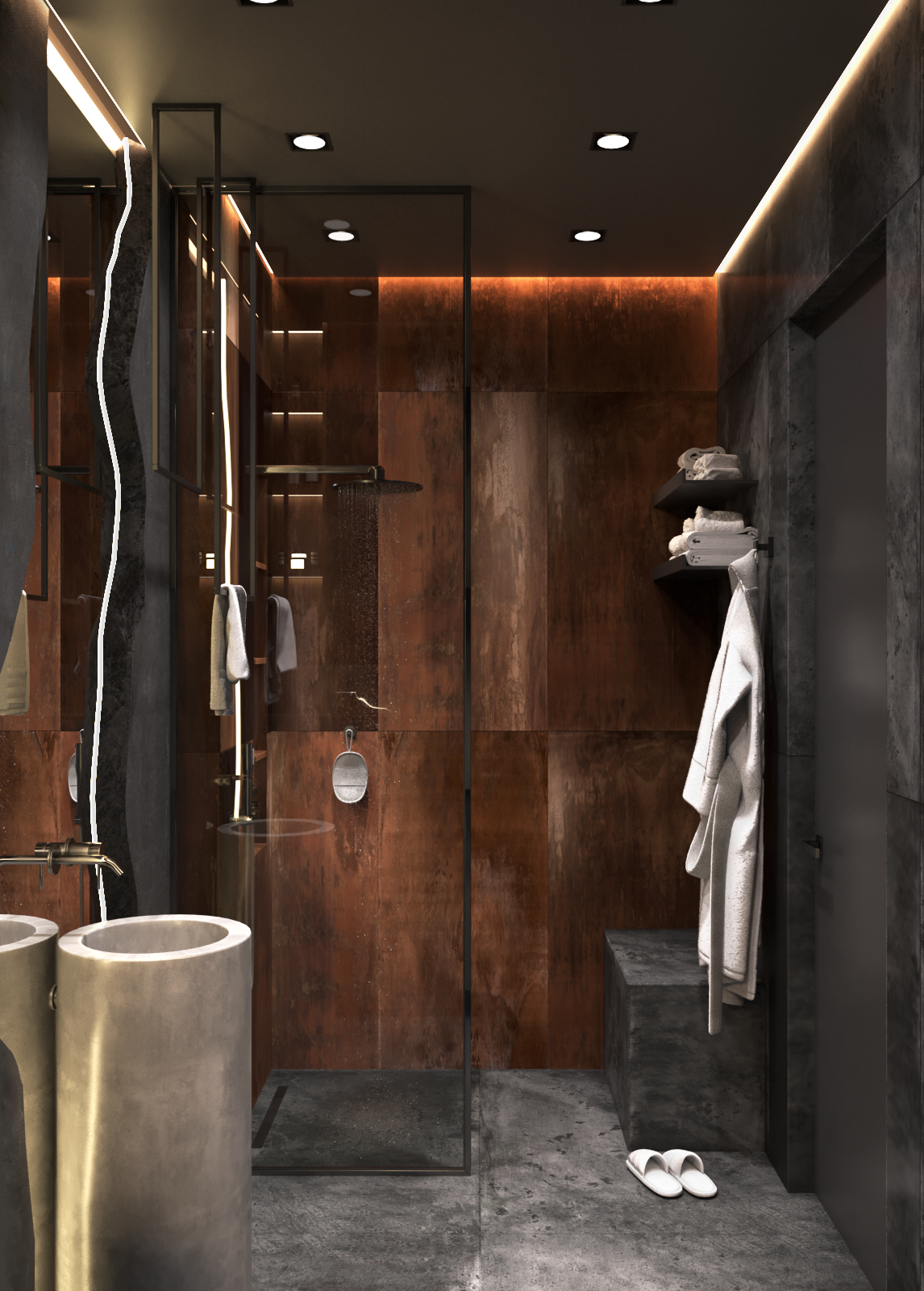 Брутальная душевая для самых смелых заказчиков. Раковина из бетона, сантехника в цветах оружейная сталь и черный, керамогранит имитирует ржавый металл.