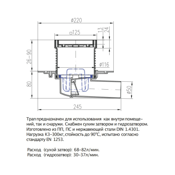 1. Сухие. Конструкцией трапа этого типа предусмотрены клапаны, перекрывающие слив. Заслонка самостоятельно раскрывается, когда появляется напор.