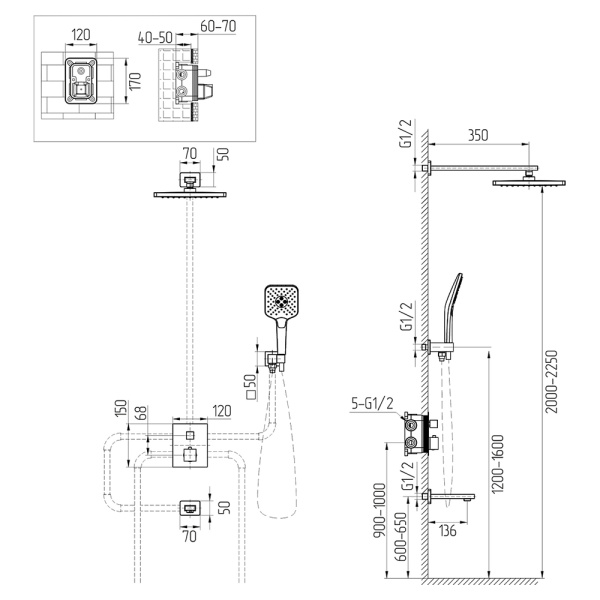Встроенные компоненты системы, такие как вентили, смесители и даже душевые форсунки, скрыты в стенах или потолке, что позволяет оптимизировать пространство. Это решение идеально подходит для тех, кто хочет сэкономить место и сохранить чистоту линий в интерьере.